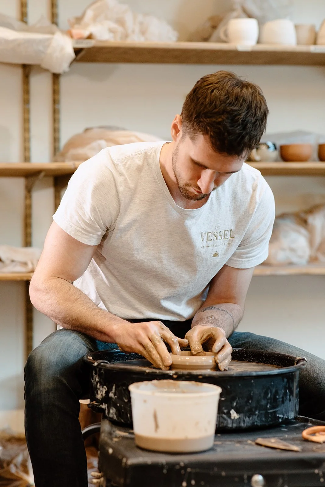 Each pair shares one wheel and takes turns learning the basics of wheel throwing. It’s a playful way to connect, make memories, and a little pottery together.